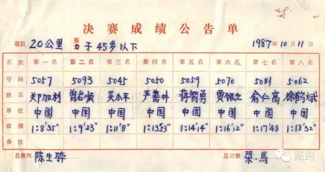 曾启顺对第一届比赛记忆犹新,他说:“1987年的比赛叫中日西湖桂花马拉松,在10月举行,距离是20公里,起终点在杭州大学附近的紫云宾馆,我最后1公里被郑加利超过。当时也有日本选手参加,颁奖取前8名,我是第2名,吴小平第3,严善井第4,非常有趣的事第7、8名是临时的名次位置牌。