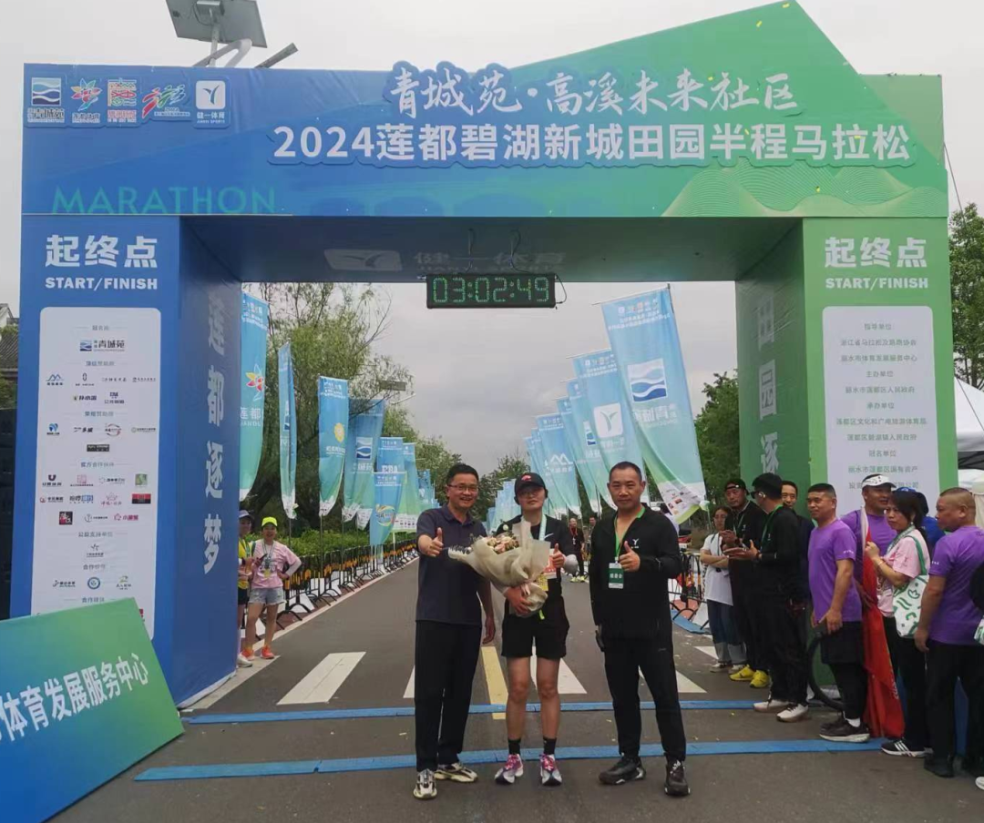 最后一位完赛参赛选手李佳琪到达终点后,得到了“冠军般”的礼遇。莲都区文化和广电旅游体育局党组副书记、副局长刘建斌(左一)、浙江健一文化体育发展有限公司总经理叶火有分别为她送上完赛奖牌和鲜花。