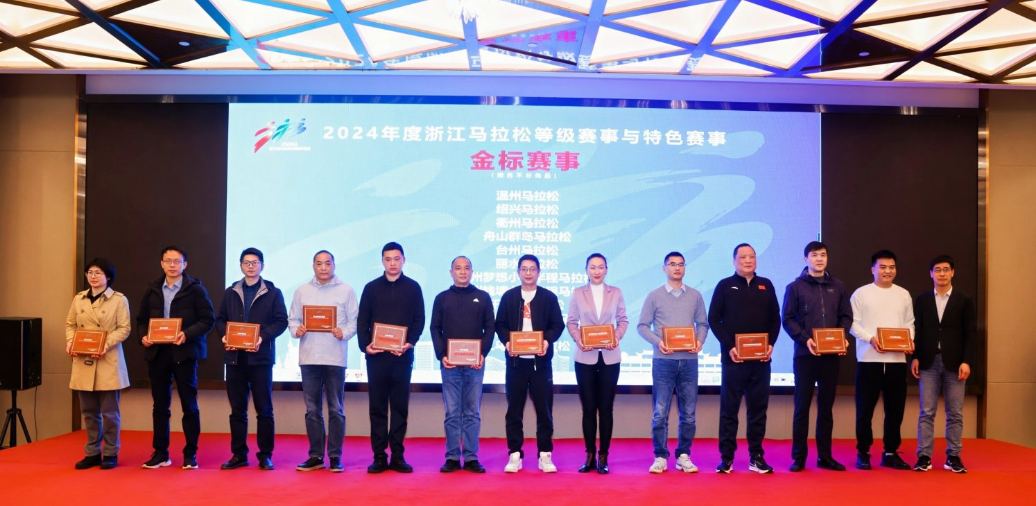 此次会议中,2024年度浙江马拉松等级赛事与特色赛事评选结果正式揭晓。 经评委会综合评审,近百场赛事申请中诞共生12场金标赛事、12场银标赛事和12场铜标赛事,以及部分特色赛事。 此外,还颁发了优秀组织奖、赛事影响力企业奖,还进行了战略合作伙伴授牌、年会承办纪念牌颁发及新增会员授牌等活动。