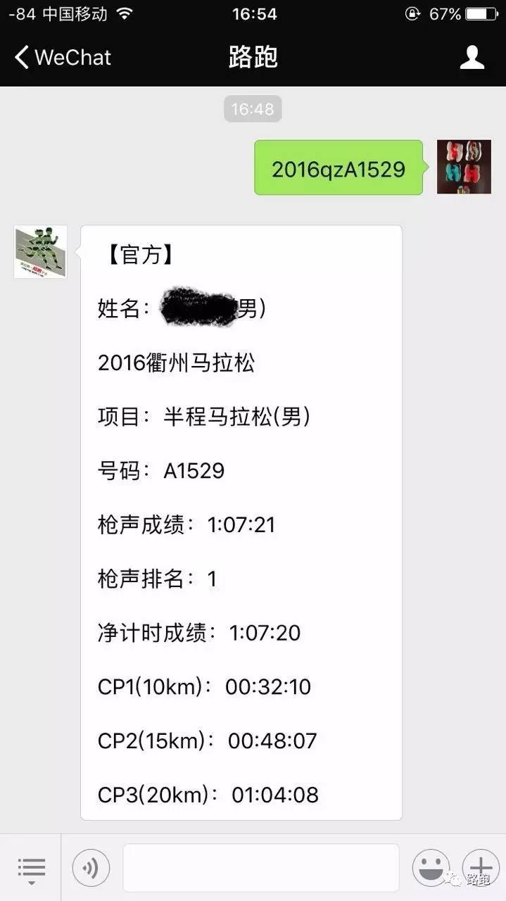 关注公众号“浙江马拉松(zjruns)”或 “路跑(hzmarathon)”回复“2016qz您的参赛号码”,如2016qzA1529 即可查询本次赛事的成绩。