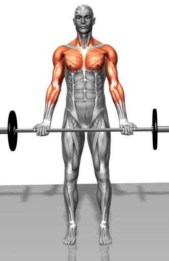 从器械架上抓取杠铃,屈肘,使杠铃下降至上胸部,向下推举杠铃至手臂伸直,还原。重复上述动作。