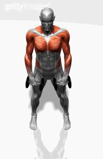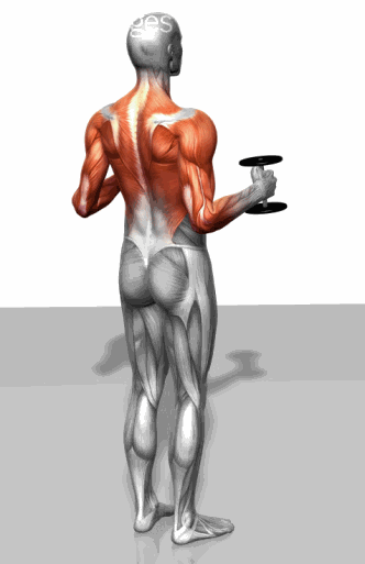 通过上提肩胛骨和锁骨上提哑铃,哑铃下降。重复上述动作。