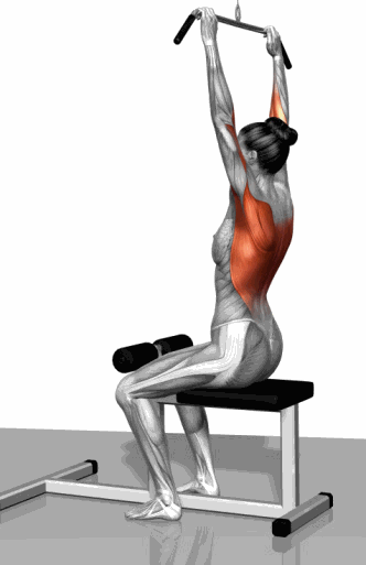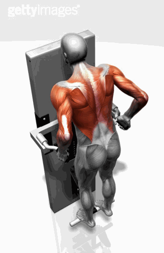 拉横杠至腰部,挺胸,肩部向后,拉至臂部呈垂直位,还原。重复上述动作。
