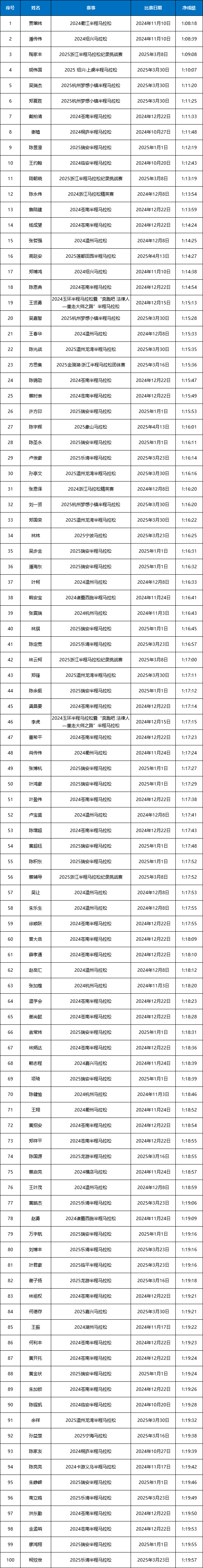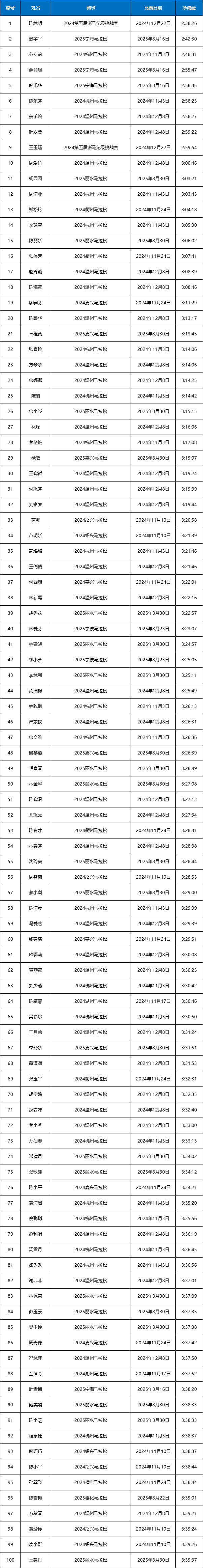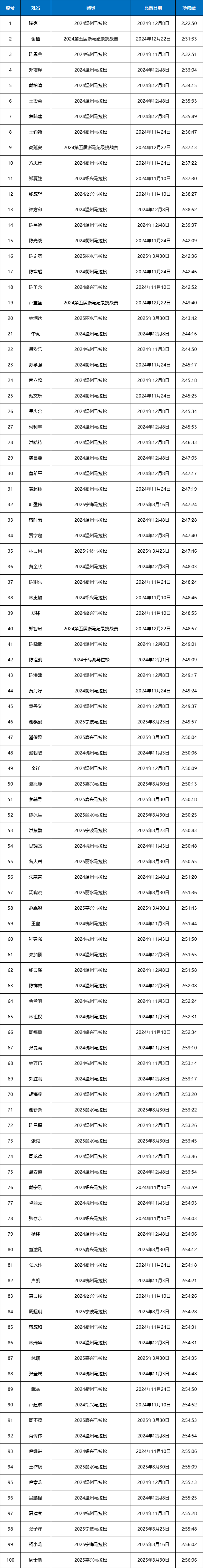 2024-2025赛季浙江马拉松积分赛男女子(中国籍)全马与半马前100名名单公布!