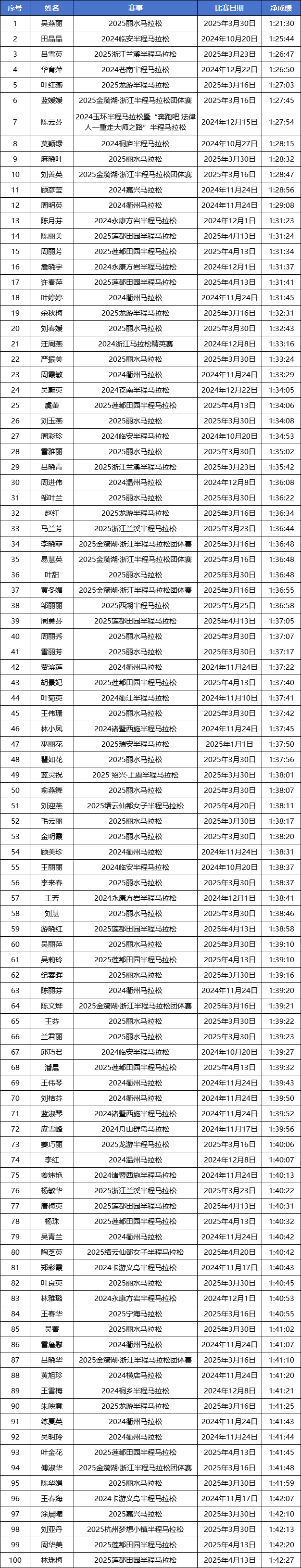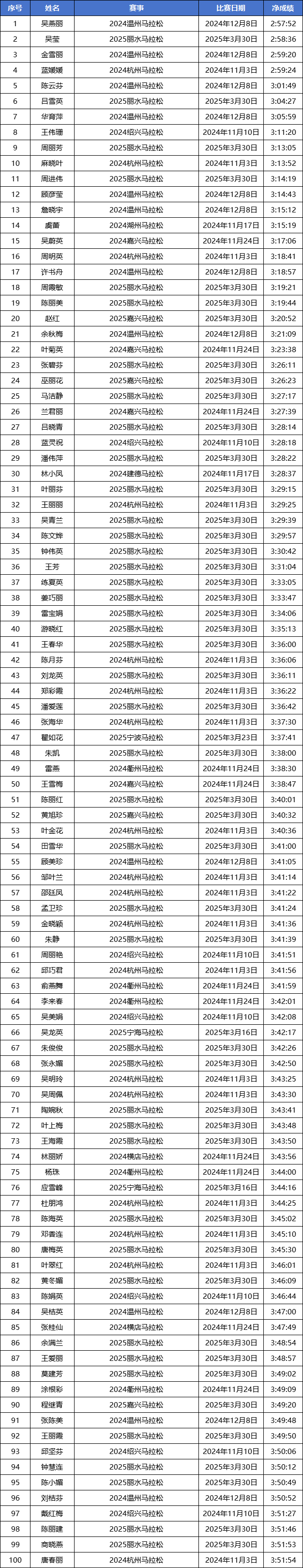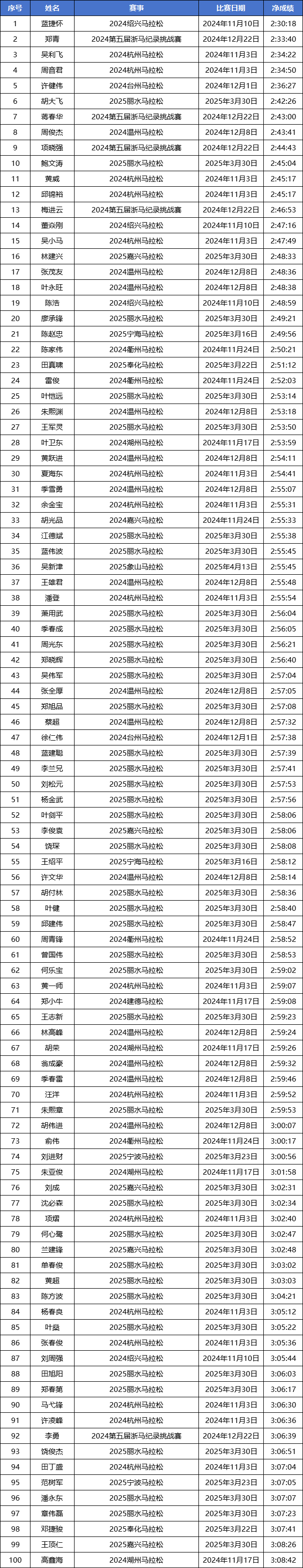 2024-2025赛季浙江马拉松积分赛男女子(浙江籍)全马与半马前100名名单公示!