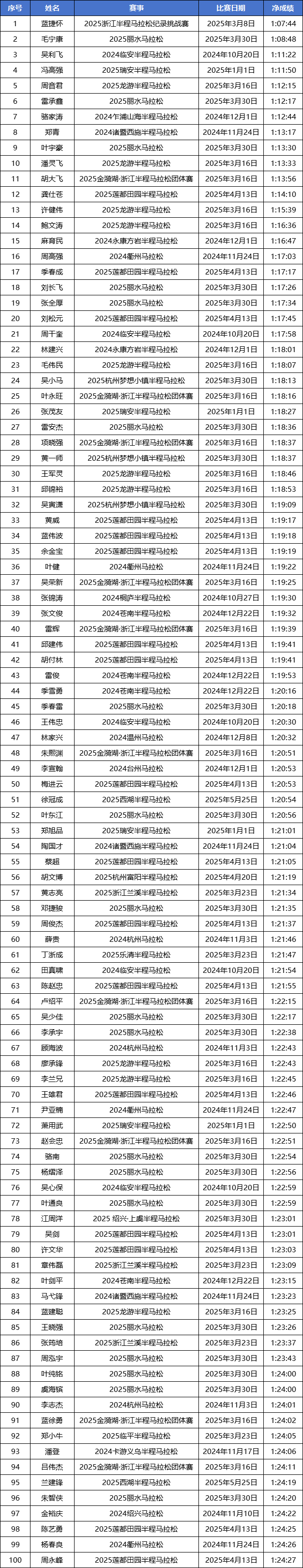 温州市-2024-2025赛季浙江马拉松积分赛男女子全马与半马前100名名单公示!