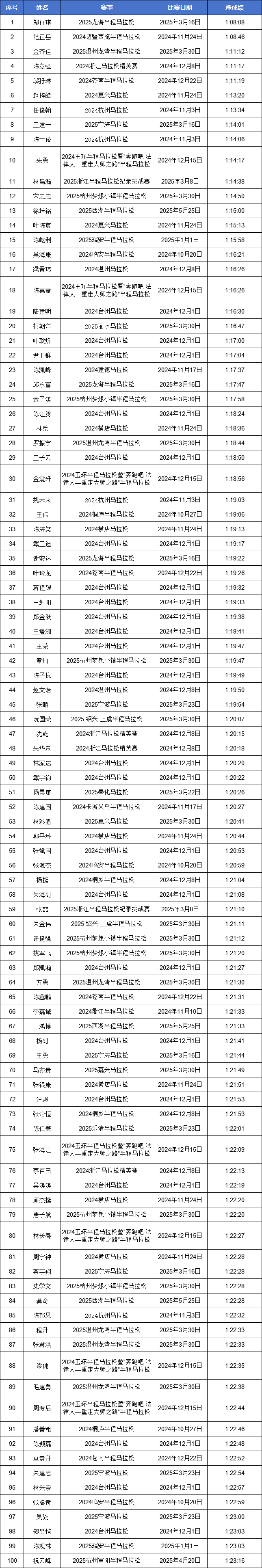 温州市-2024-2025赛季浙江马拉松积分赛男女子全马与半马前100名名单公示!