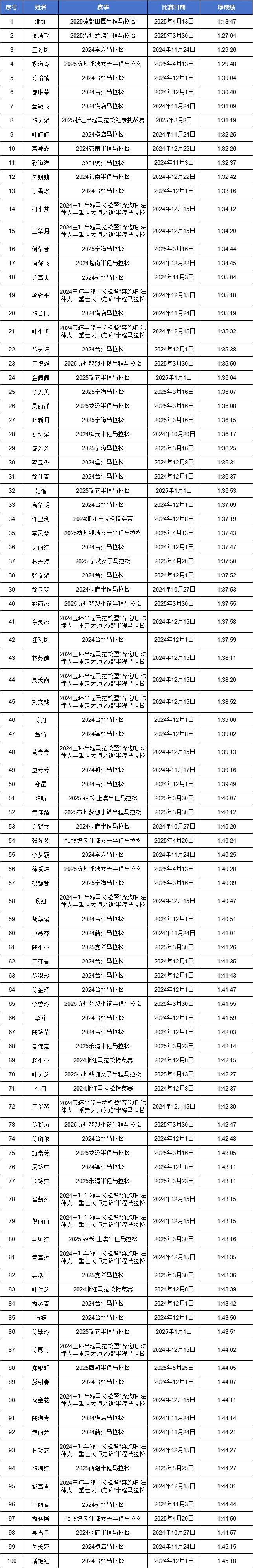 2024-2025赛季浙江马拉松积分赛男女子(浙江籍)全马与半马前100名名单公示!