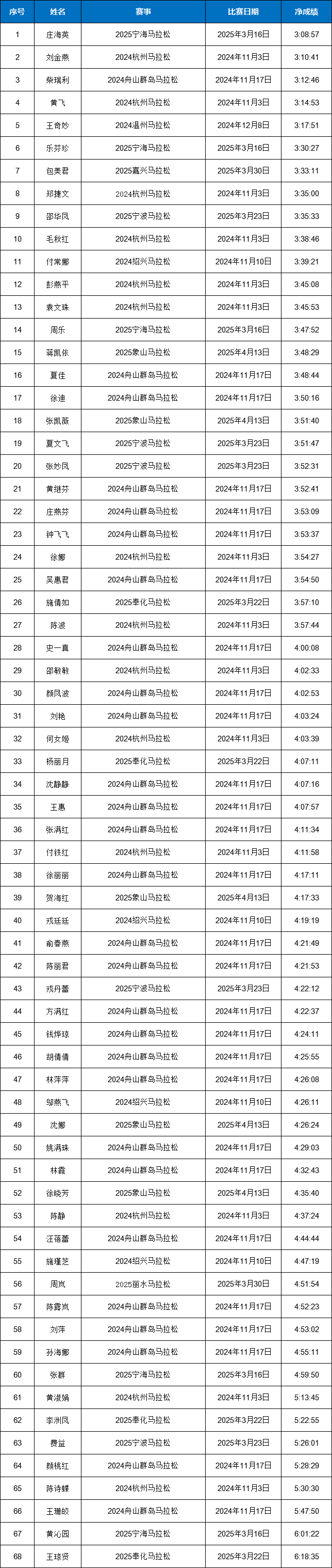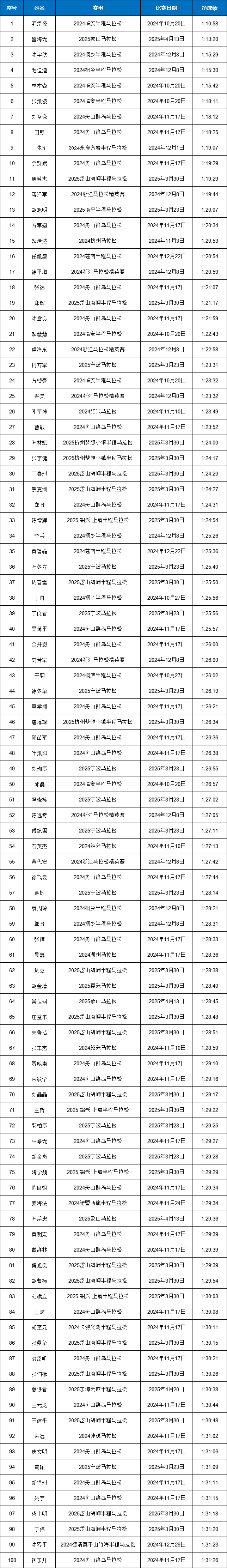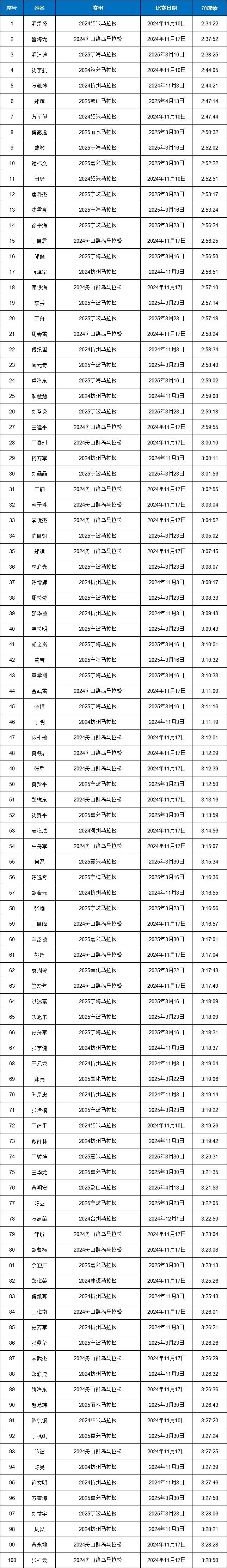 宁波市-2024-2025赛季浙江马拉松积分赛男女子全马与半马前100名名单公示!