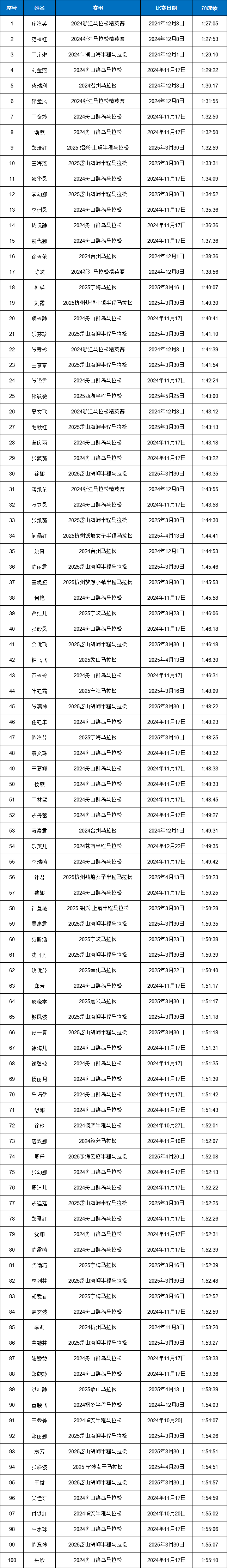 2024-2025赛季浙江马拉松积分赛男女子(浙江籍)全马与半马前100名名单公示!