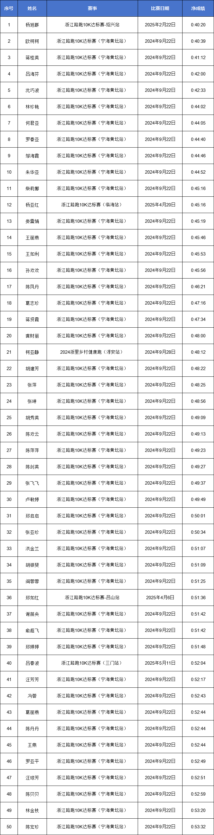 宁波市-2024-2025赛季浙江马拉松积分赛男女子全马与半马前100名名单公示!