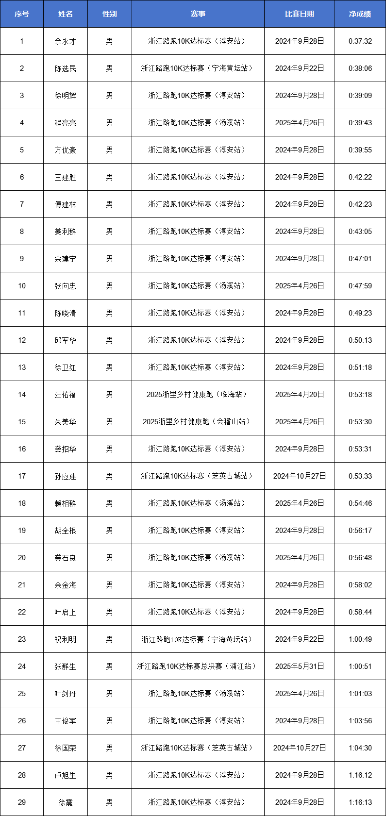 丽水市|2024-2025赛季浙江马拉松积分赛男女子全马与半马前100名名单公示