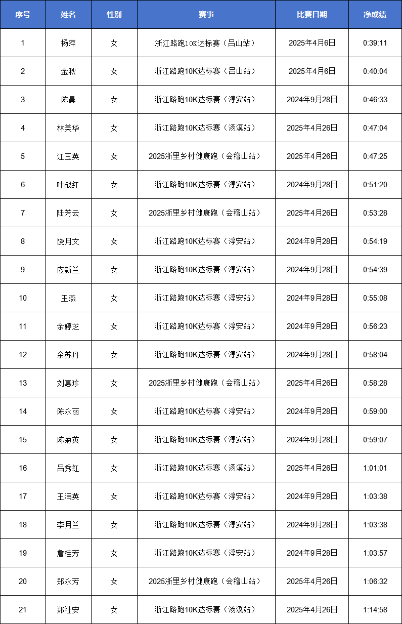 2024-2025赛季浙江马拉松积分赛男女子(浙江籍)全马与半马前100名名单公示!