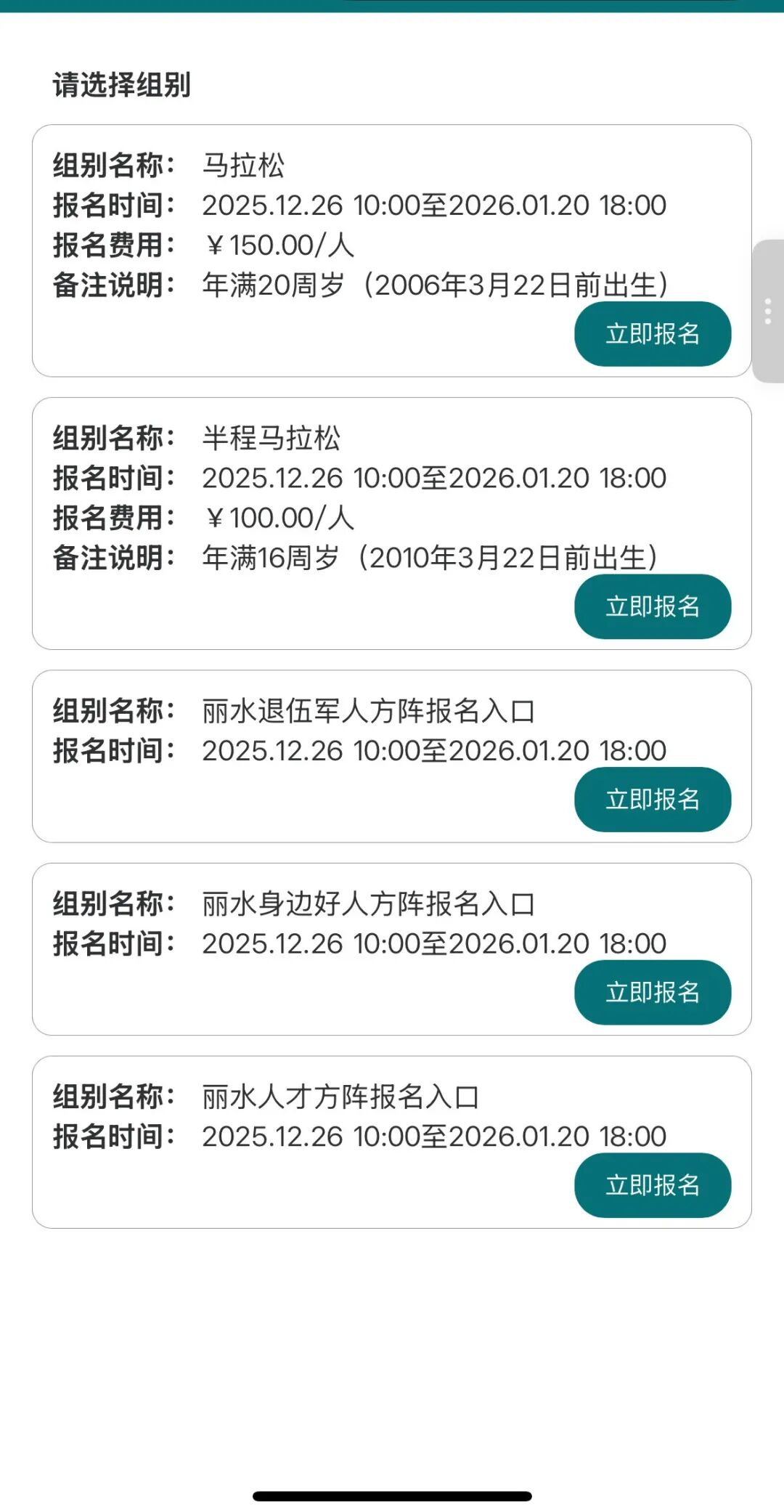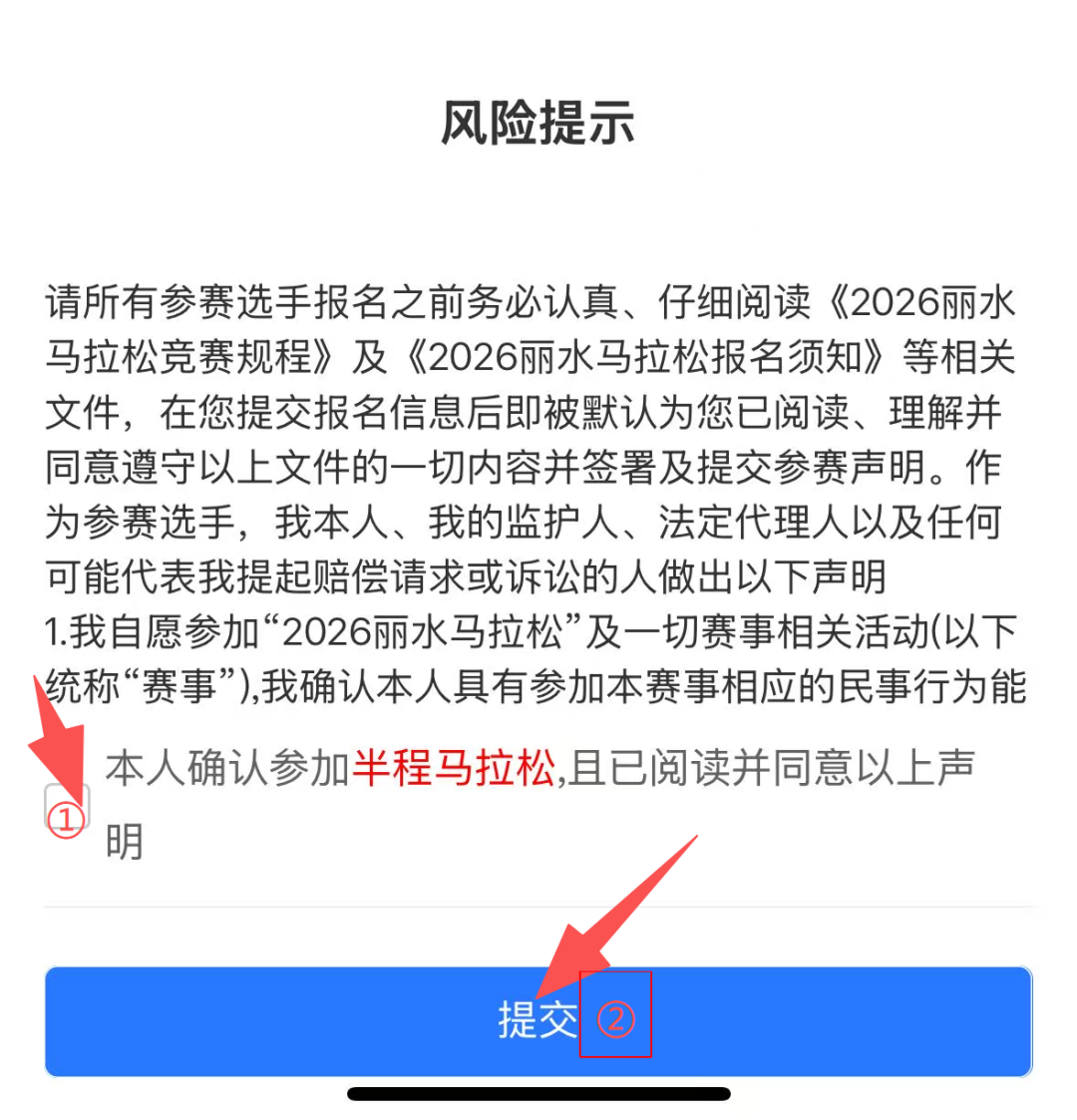 2.报名方法:通过浙江马拉松官网(www.zjim.org)或关注浙江省马拉松及路跑协会微信公众号申请,按申请先后顺序,马拉松前10名及半程马拉松前30名(须符合2026丽水马拉松参赛选手身体状况要求和规程要求,并且在浙江马拉松系列赛免费参赛资格不超过2次)免收报名费。