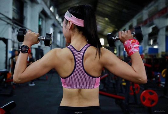 粉红色的背面也很好看,是健身房撸铁必备利器