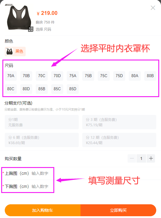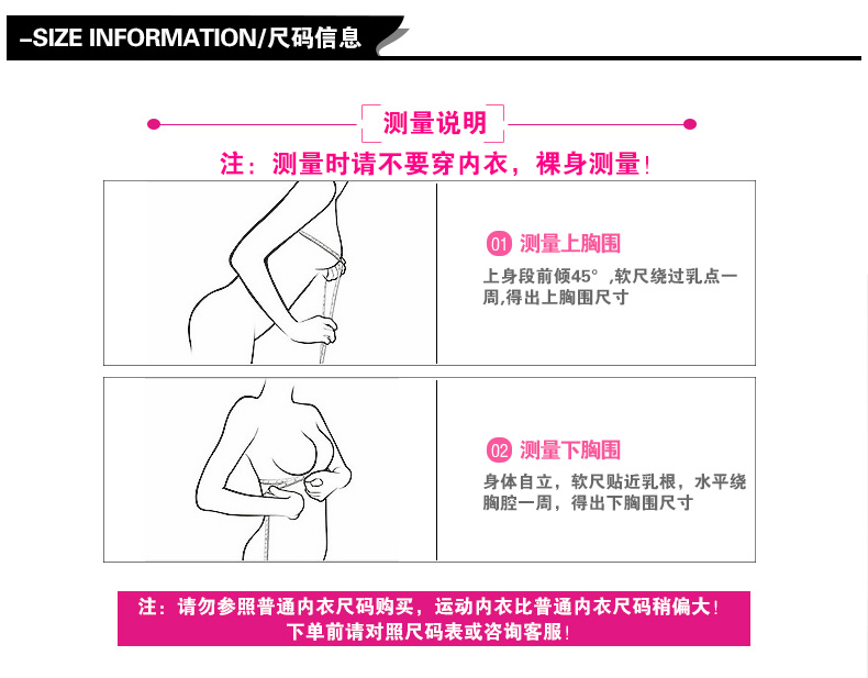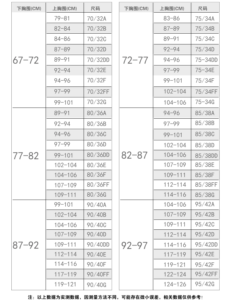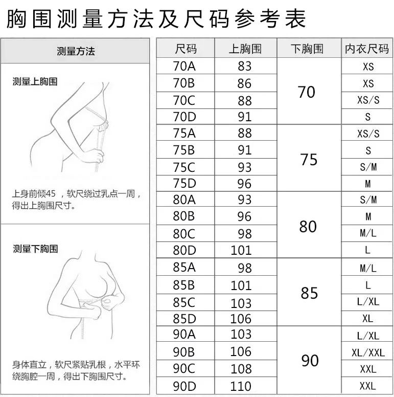 每个胸部都是独一无二的,有着自己的尺码。大部分的内衣,只有大、中、小码这样的简单尺寸区分,这样的统一尺码,很可能会造成胸衣不够贴合,从而产生摩擦、勒胸等问题。S4246把尺码细分了15个尺码(70A-85D),可以根据不同的罩杯及胸围尺寸来选择最适合自己胸部的避震内衣。大家务必按照下面的方法自己测量一次胸部尺寸,并在下单时填入相应的数据,选择平时穿着内衣的罩杯,以便我们给您推荐最适合的尺码。