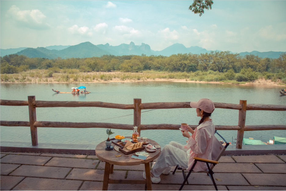 富有江南特色的楠溪建筑,质朴的白墙黑瓦,休闲的原木风装修,坐拥最富楠溪江特色的美景,南崖,滩林,楠溪江,上午看云雾缭绕,傍晚赏“枫林晚霞”,层次丰富,变幻无常。这里无疑是欣赏落日的最美江景咖啡馆,坐下来静心喝一杯咖啡或者茶,无意间便收获了生命的辽阔与美丽。