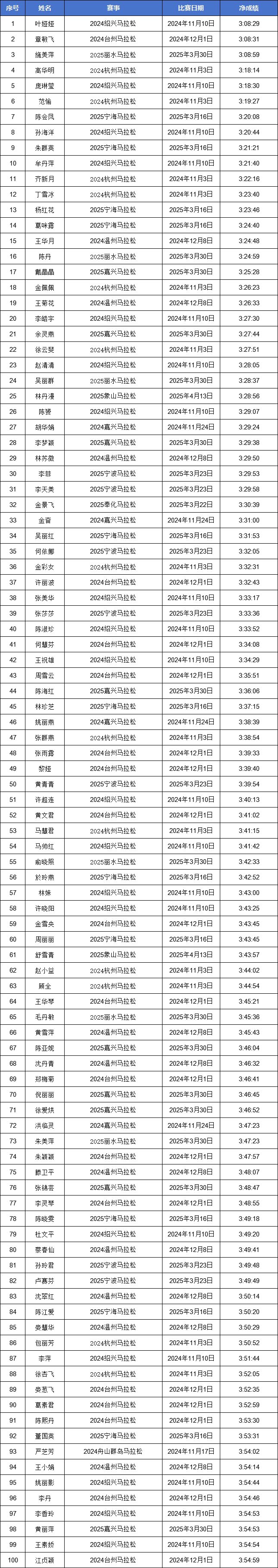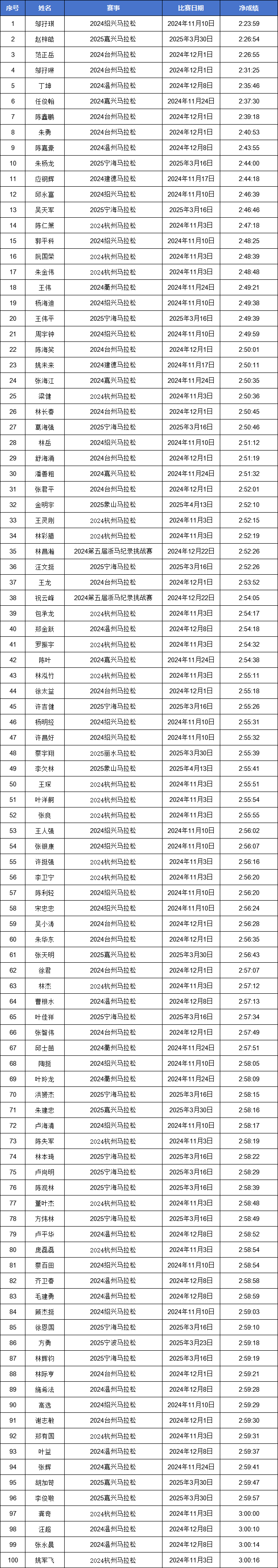 2024-2025赛季浙江马拉松积分赛男女子(浙江籍)全马与半马前100名名单公示!