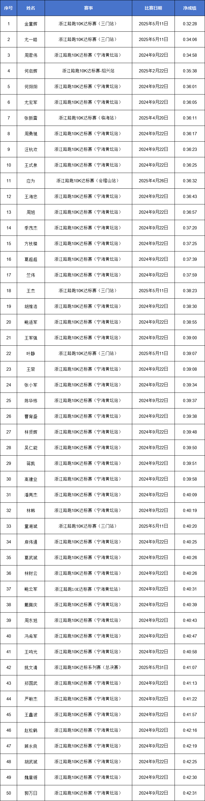 宁波市-2024-2025赛季浙江马拉松积分赛男女子全马与半马前100名名单公示!