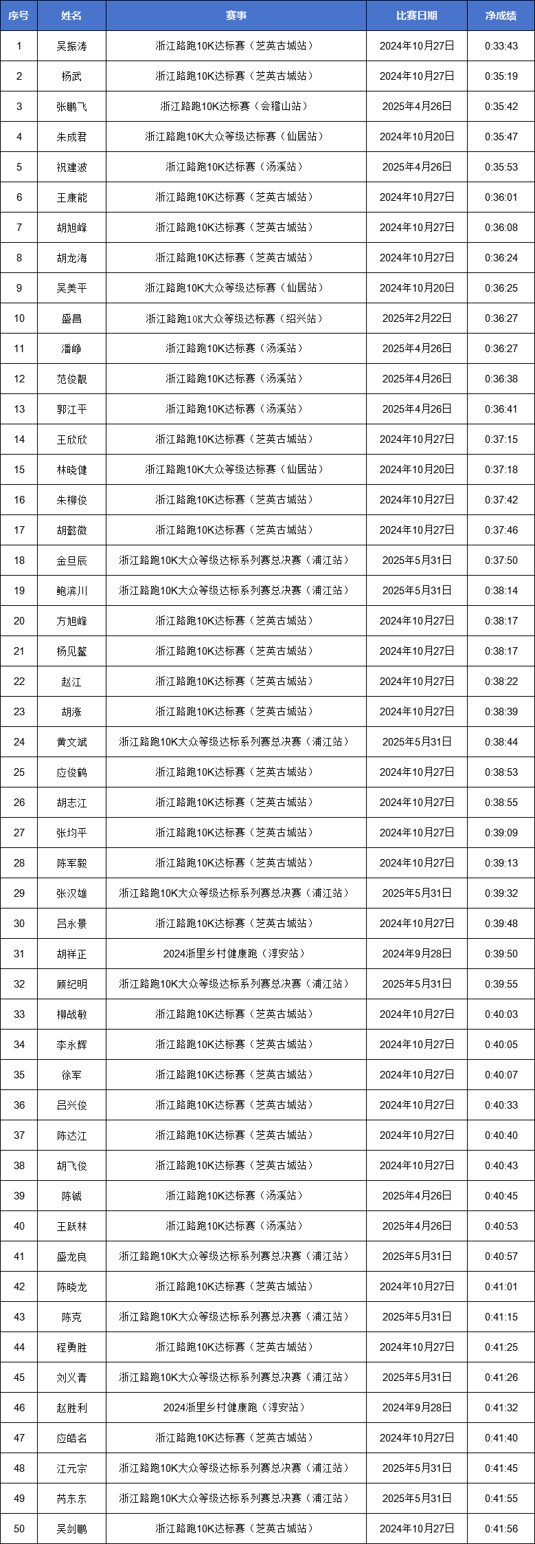 浙江路跑10K达标赛各市男女子前50名名单公示——温州