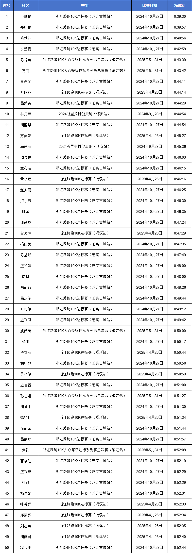 浙江路跑10K达标赛各市男女子前50名名单公示——湖州