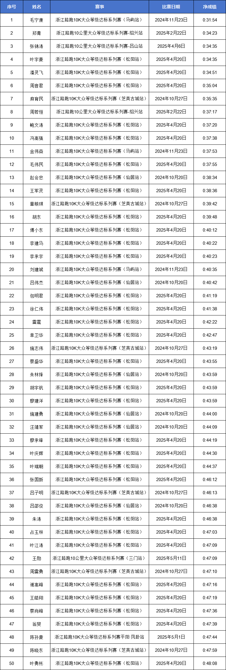 浙江路跑10K达标赛各市男女子前50名名单公示——温州