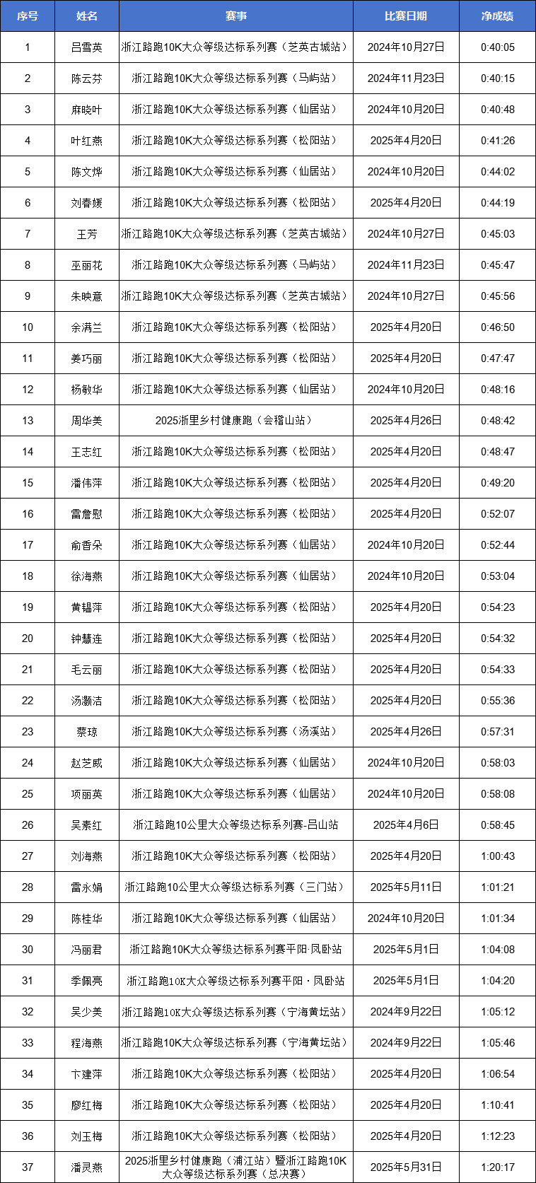 2024-2025赛季浙江马拉松积分赛&达标赛男女子前三公布